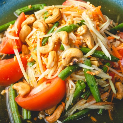 Med tomater, gulerodsstrimler, thailandske grønne lange bønner, cashewnødder og saltede jordnødder blandet med en stærk chilimarinade.
